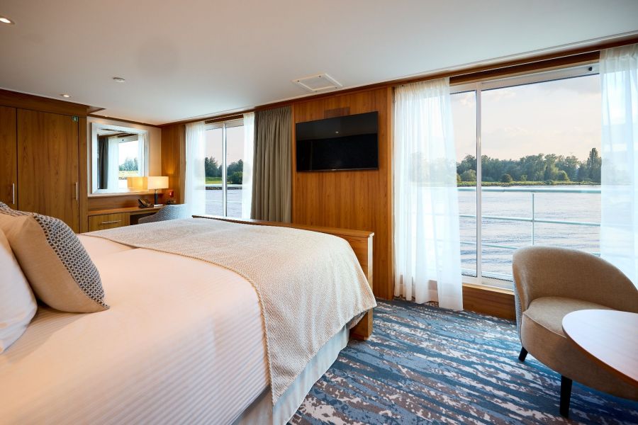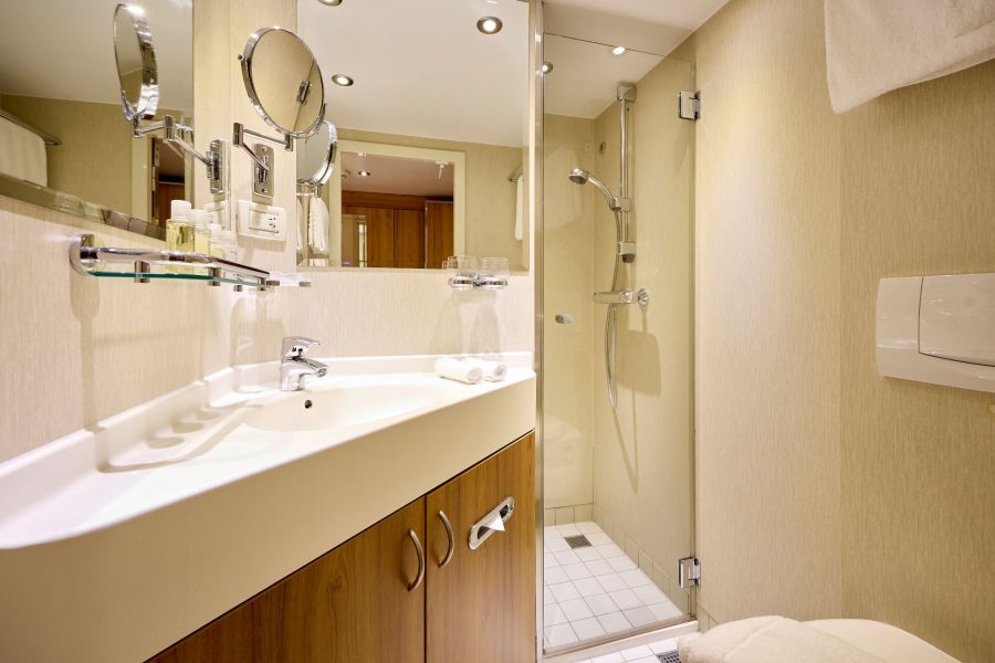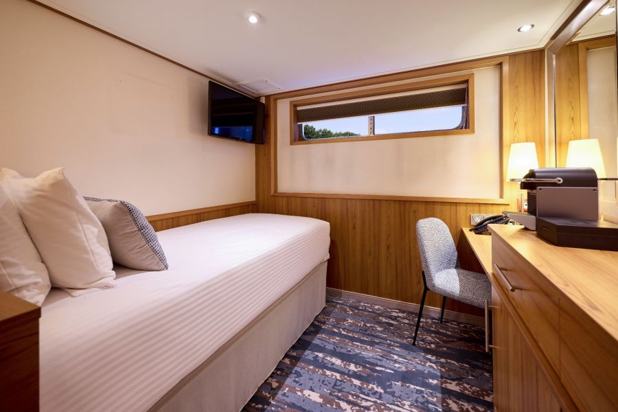 Каютите са разположени на 3 палуби, като на основна палуба разполагат с илюминатори, които не се отварят, на средна с отваряеми прозорци и на горна с големи френски прозорци, които също се отварят. Всички каюти имат индивидуален климатик, сателитна ТВ, сешоар, баня и тоалетна. Площта им е около 14 кв. м.