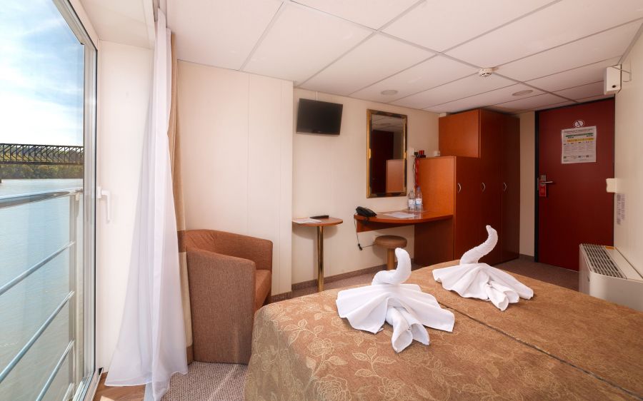 Каютите са разположени на 3 палуби, като на основна палуба разполагат с илюминатори, които не се отварят, на средна с отваряеми прозорци и на горна с големи френски прозорци, които също се отварят. Всички каюти имат индивидуален климатик, сателитна ТВ, сешоар, баня и тоалетна. Площта им е около 14 кв. м.