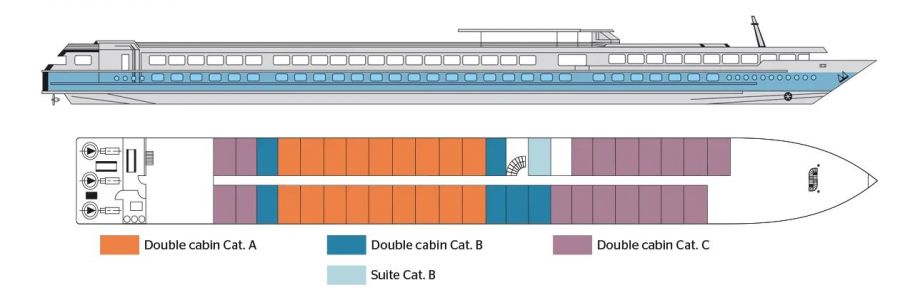 Каютите са общо 67, разпределени на 2 палуби, с площ около 12.50 кв. м. На основната има общо 43 каюти с прозорец. На горната палуба се намират 24 кабини с отварящи се в горната част (плъзгащи) прозорци.