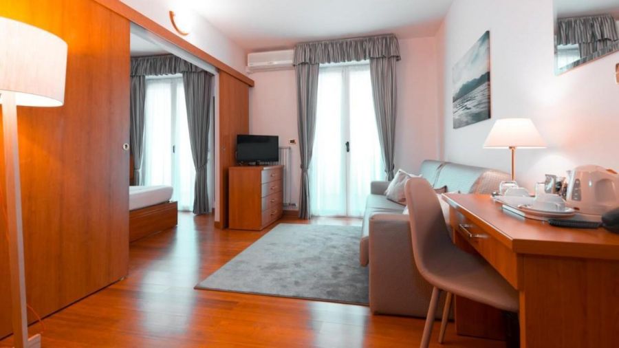 Superior room – 42 кв.м, предлага настаняване до 6 души. Голямата площ е разделена на 2 спални, едната с двойно легло, а другата с двоен разтегателен диван и 1 всекидневна зона с разтегателен диван с две разтегателни легла.