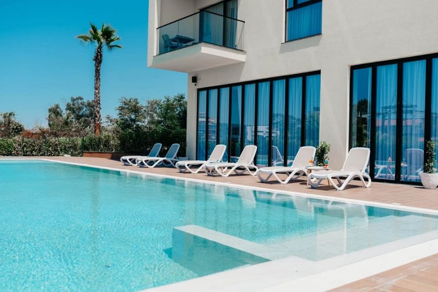 Собствен - пясъчен. Чадъри и шезлонги на плажа и басейна - безплатно.