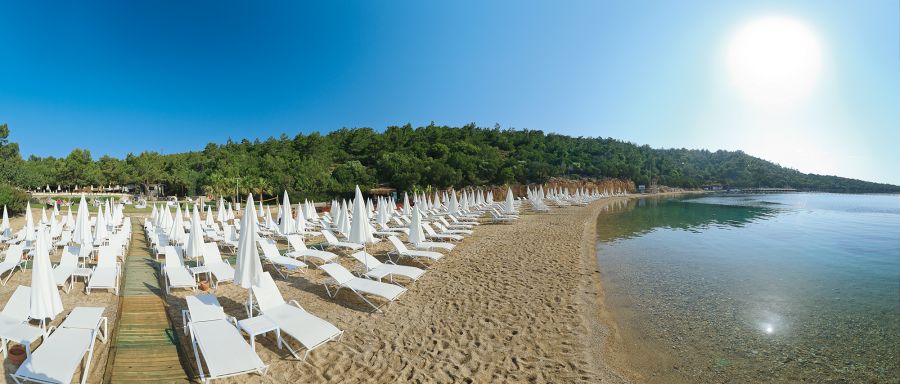 Собствен пясъчno-чакълест плаж и 2 платформи. Чадъри, шезлонги на плажа и при басейна - безплатно. Плажни кърпи срещу депозит.