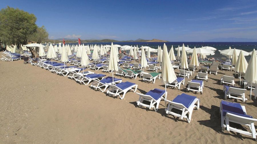 Собствен, пясъчно - чакълест. Чадъри, шезлонги на плажа и при басейна – безплатно. Плажни кърпи - срещу депозит.