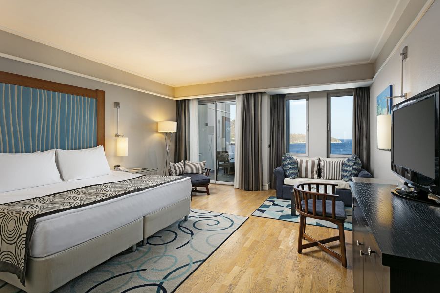Стаи: Courtyard suite (1 спалня, зона за сядане, 1 баня - 51 М²), Sunset suite room (1 спялня, 1 хол, 1 баня, изглед море - 70 М²), Manor house suite room (1 спялня, 1 хол, 1 баня, изглед море - 72 М²), Romance suite room (1 спалня, зона за сядане, 1 баня - 60 М²), King suite (1 спялня, 1 хол, 1 баня, изглед море - 85 М²), Elegance suite (2 спялни, 1 хол, 1 баня, изглед море - 92 М²), Lavender suite (2 спялни, гардеробна, 1 баня, изглед море - 110 М²), Suite Room (2 спялни, 1 хол, 1 баня, изглед море - 124 М²), Royal suite room (3 спялни, 1 хол с трапезария, 2 бани- 238 М²)