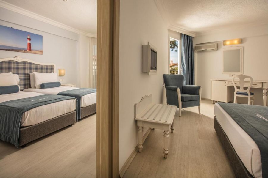 Хотелът разполага с 354 стаи, от които 250 стандартни стаи с изглед градина или с изглед море (20-23 кв.м), 68 фамилни стаи (две свързани помещения и с две бани, 44-46 кв.м.), 30 стандартни стаи с джуетажни легла (23 кв.м), 4 апартамента (спалня, всеоткриткидневна, баня с джакузи, 44 кв.м) и 4 стаи за инвалиди. Всички стаи са оборудвани с климатик, телевизор, телефон, баня с душ, сешоар, сет за чай/кафе, минибар (безплатен), сейф (безплатен), балкон или тераса, Wi-Fi интернет. Почистване на стаите – всеки ден, смяна на бельото – 2 пъти в седмицата, смяна на кърпите – 3 пъти в седмицата.