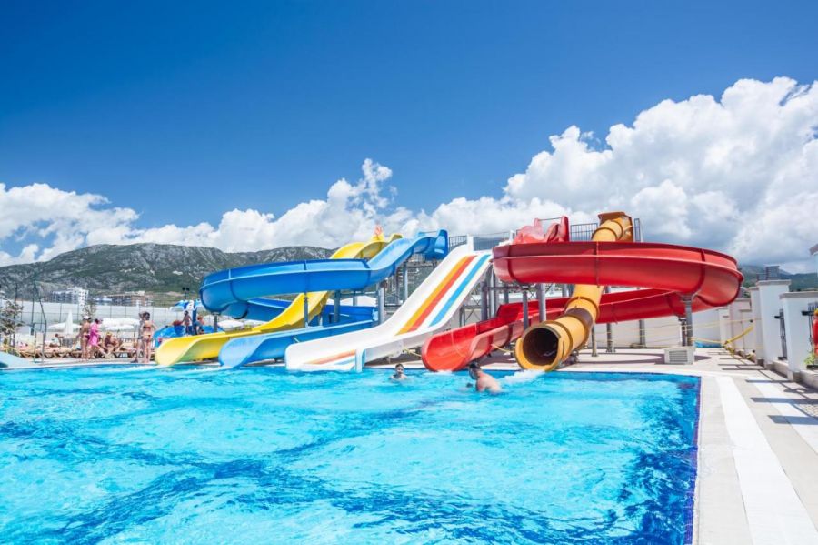 За децата: 2 открити детски басейна и 1 закрит, детска площадка, мини клуб (4-12 г), рисуване на лица, форми от балони, мини диско, детска анимация.