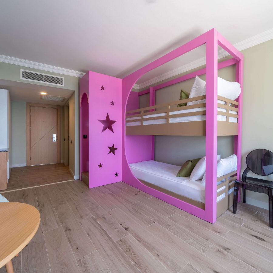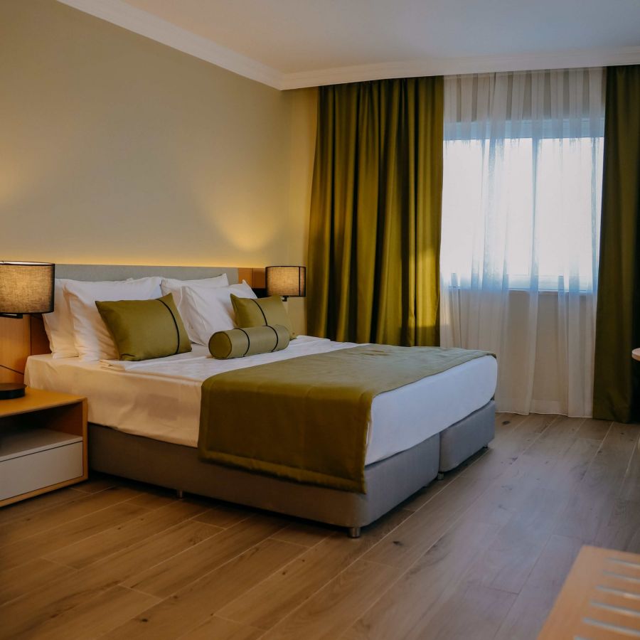 Хотелът разполага с общо 250 стаи, от които 66 стандартни стаи с изглед градина (20-30 m²), 138 стандартни стаи с изглед море (20-30 m²), 7 промо стаи (20-30 m²), 10 джуниор суита (спалня и всекидневна, 60 m²) и 29 фамилни суита (2 спални, 2 бани, 60 m²), разположени в основна сграда. Всички стаи са оборудвани с климатик, телефон, телевизор, баня с душ, сешоар, сет за кафе/чай, мини бар ( eжедневно зареждане с вода и безалкохолни напитки), сейф (безплатно), Wi-Fi, балкон в някои от стаите. Почистване на стаите - всеки ден, смяна на спалното бельо - 2 пъти в седмицата.