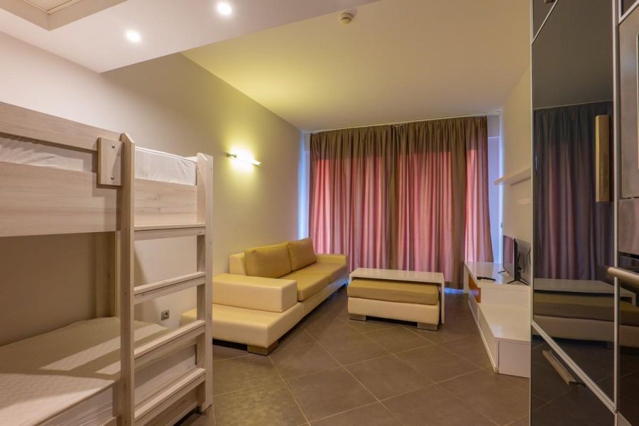 Хотелът разполага с 220 стаи, от които 87 стандартни стаи (21 м2) - спалня или две единични легла, 22 стаи с двуетажни легла (27 м2) - спалня и двуетажни легла, 102 фамилни стаи (44 м2) - една спалня и една всекидневна с разтегателен диван или две спални, 5 пентхауса (68 м2) - спалня и една вскидневна и 4 пенхтхауса (72 м2) - две спални и една всекидневна. Всички стаи са оборудвани с климатик, телевизор, телефон, баня с душ, сешоар, минибар (безплатен еднократно при настаняване, ежеднвено зареждане с минерална вода), сейф (безплатен), балкон. Почистване на стаите - всеки ден, смяна на кърпи и спално бельо - 3 пъти седмично.