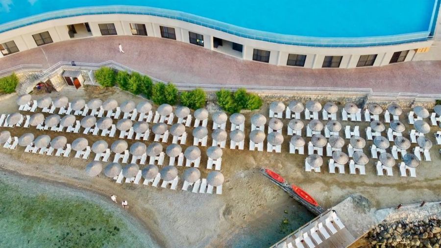 Собствен плаж и с платформа. При басейна и на плажа: чадъри, шезлонги и кърпи - безплатно.
