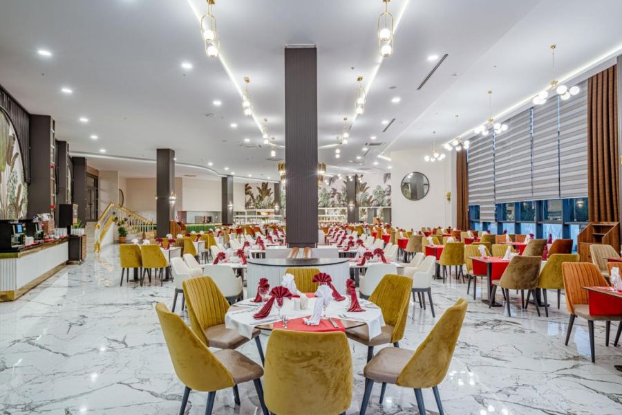 Основен ресторант, а-ла-карт ресторант – интернационален (1 безплатно посещение минимум 7 нощувки), сладкарница, 3 бара, открит и закрит басейн, водни пързалки, СПА център.