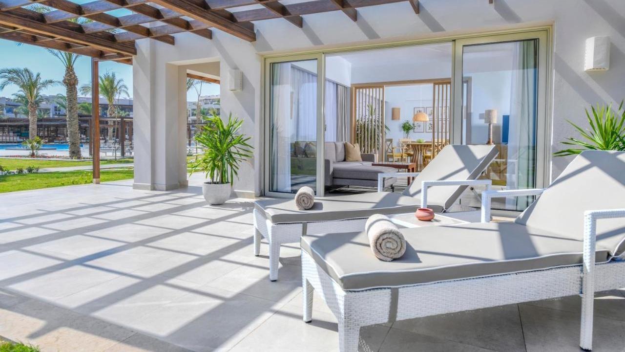 - DELUXE FAMILY ROOM POOL & SEA VIEW- 45 кв.м, една стая с двойни или две единични легла, два дивана, баня, тераса с изглед към басейна и морето.