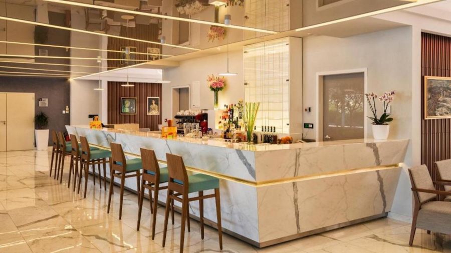 Бар с панорамна гледка към морето, перфектен за релаксация и наслаждаване на коктейли в приятна атмосфера.