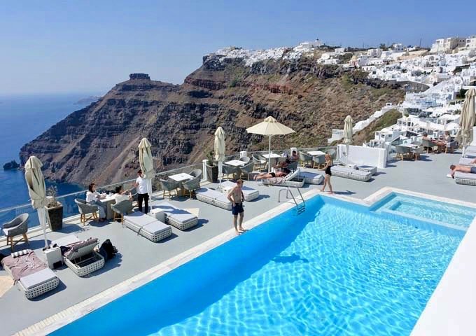 В хотела: 24 часова рецепция, басейн с шезлонги и чадъри и гледка към Калдерата, бар, Wi-Fi, СПА център.