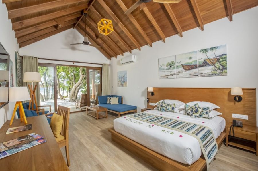 В стаите: Reethi Faru Resort предлага 150 традиционни луксозни малдивски вили, обзаведени с вкус, с много дърво и елегантни дизайнерски елементи. Има различни типове – с хидромасажна вана, сгушени сред тропическите градини, разположени на плажа или на пилони над тюркоазените води. Всички климатизирани стаи разполагат с минибар, сейф, сателитна телевизия и удобства за приготвяне на чай и кафе.
