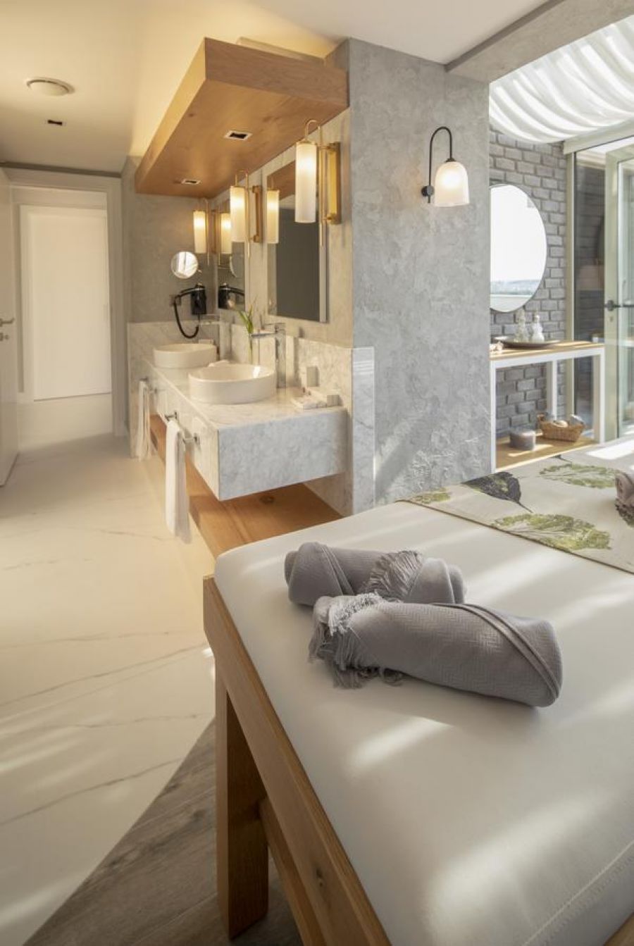Стаи Main building: 74 Deluxe Room with Partial Sea View (частичен изглед море - 38м2), 84 Deluxe Room with Partial Sea and Pool View (частичен изглед море и басейн - 38м2), 36 Deluxe Room with Sea View (изглед море - 48 м2), 16 Corner Suite with Jacuzzi & Sea View (спалня, баня, тераса с джакузи - 48 м2), 4 Designer Suite (спалня и хол разделени с врата, баня, кафе Nespresso, тераса с джакузи - 68 м2), 3 Grand Designer Suite (изглед море, спалня и хол разделени с плъзгаща врата, 2 бани, кафе Nespresso, тераса с джакузи - 106 м2), 3 Designer Suite 360 (спалня с кръгло легло, баня, кафе Nespresso, тераса с джакузи - 55 м2).