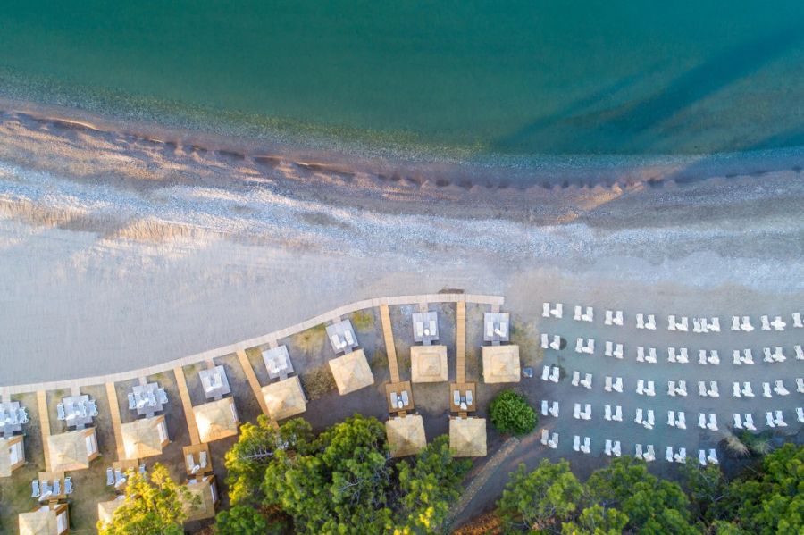 Собствен, пясъчен с камъчета, с дължина 220 м. Чдъри, шезлонги и кърпи – безплатно. Гостите имат възможността да наемат кабана на плажа между 10:00-18:00 (срещу заплащане).